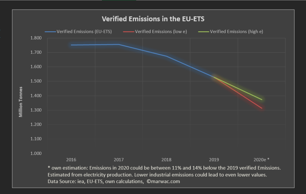 Furthermore the Airline sector ist still receiving free allocations. In the past they have not been sufficient and airlines have been buying EUAs for compliance. In 2019 emissions in the EU-Airline ETS were 68.24Mt. There was a free allocation of 32.2Mt which means the remaining 36.04Mt needed to be purchased as EUAs from the EU-ETS. Estimations by the IATA in April 2020 expected a decrease of 38% in airline emissions.